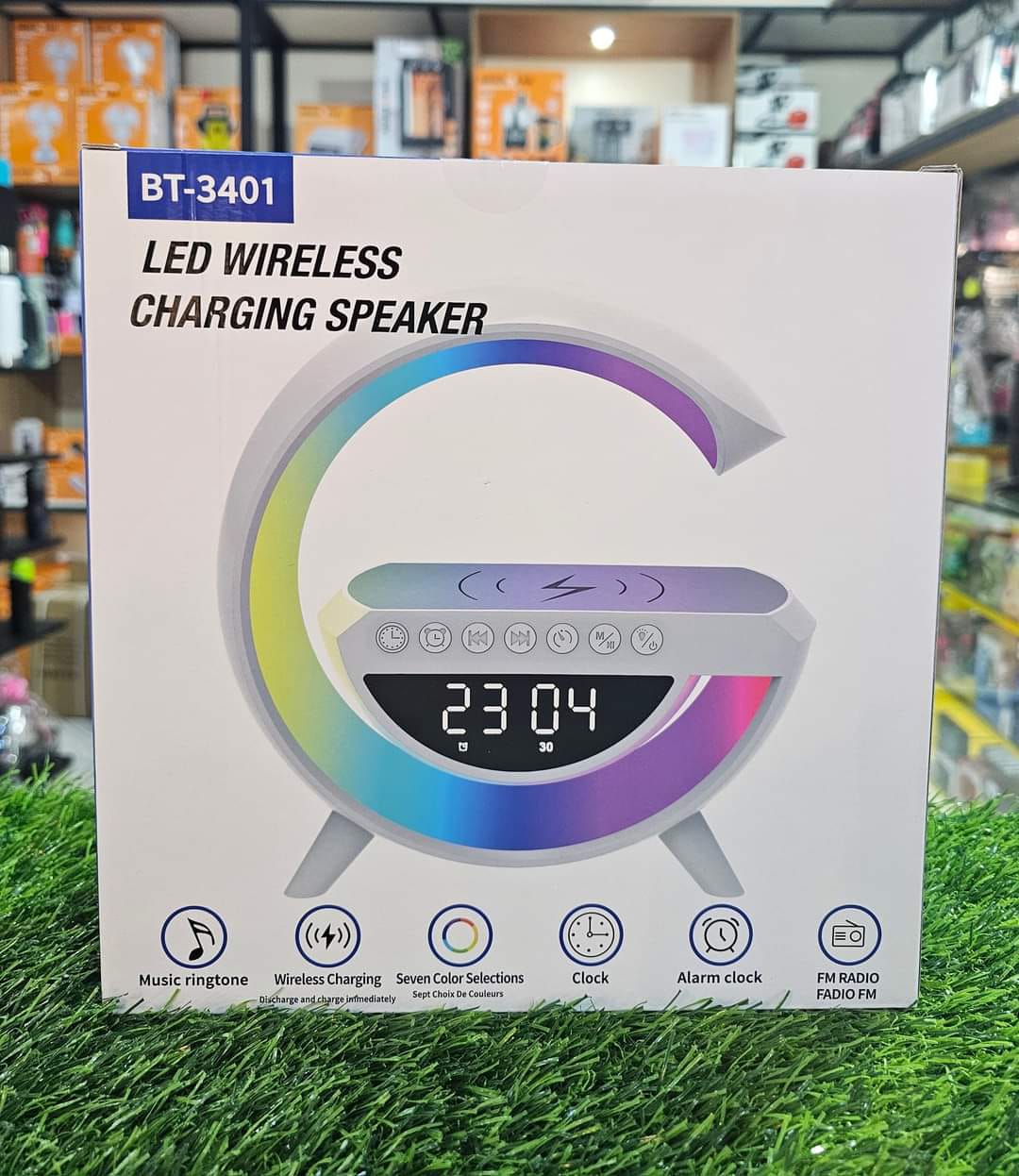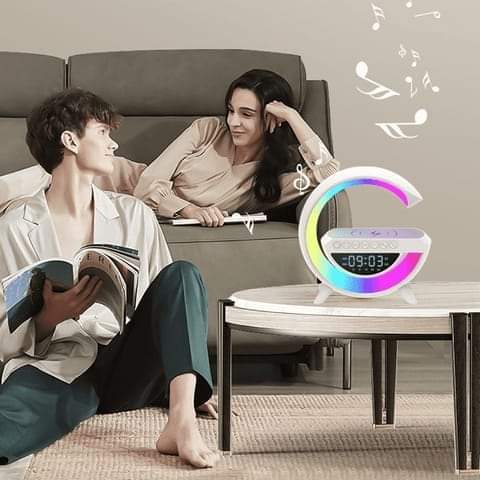 LAMPARA LED CON CARGADOR INALAMBRICO PARA CELULAR Y SPEAKER BLUETOOTH CON RELOJ
